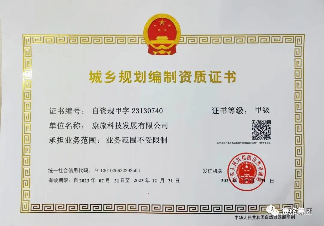 近日,經(jīng)自然資源部審查批準(zhǔn),康旅控股集團(tuán)旗下康旅科技發(fā)展有限公司(康旅產(chǎn)業(yè)研究院)城鄉(xiāng)規(guī)劃編制資質(zhì)成功升級(jí)為甲級(jí)!